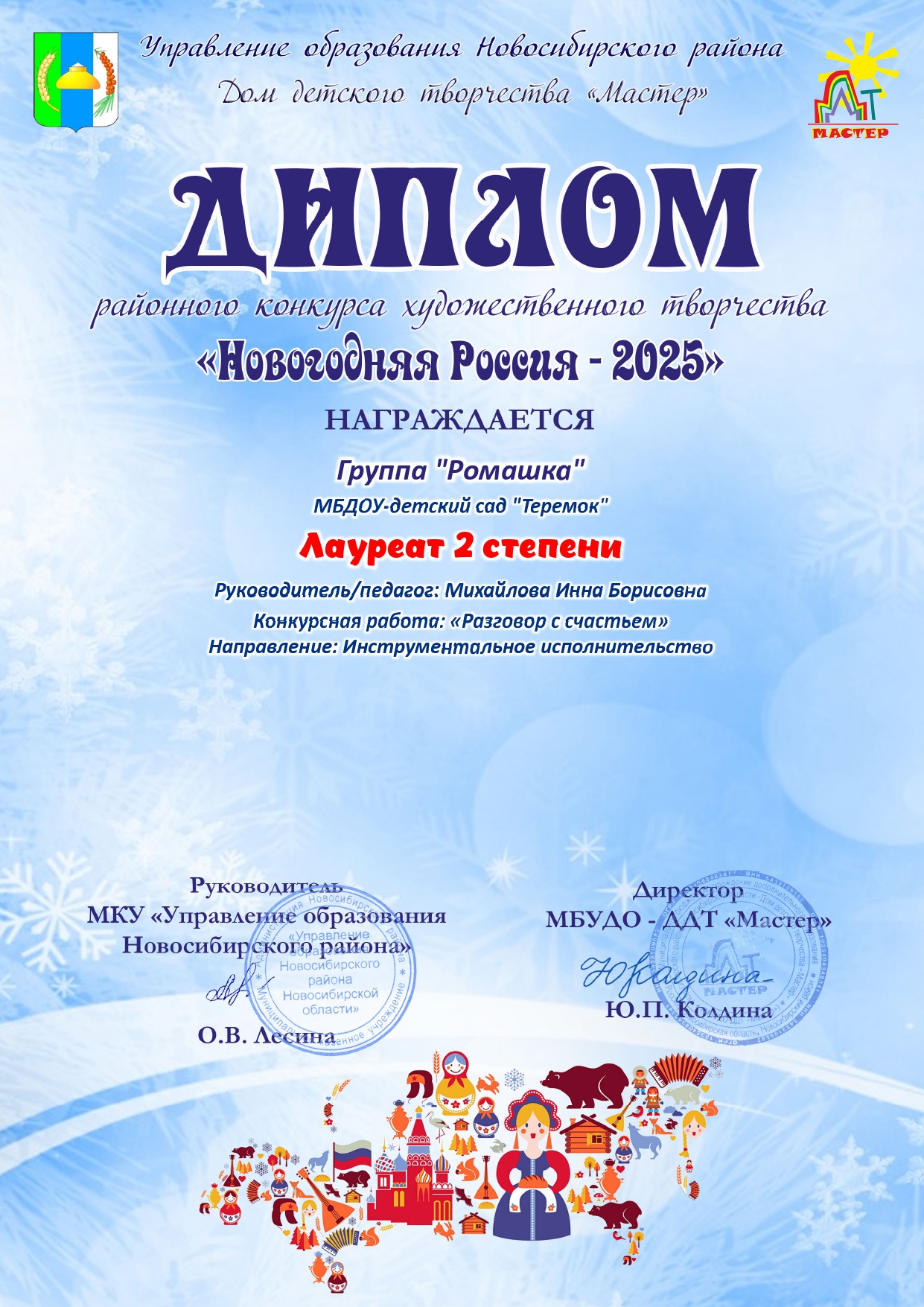Диплом Лауреата 2 степени районного конкурса "Новогодняя Россия - 2025" оркестр "Разговор со счастьем" группа "Ромашка"