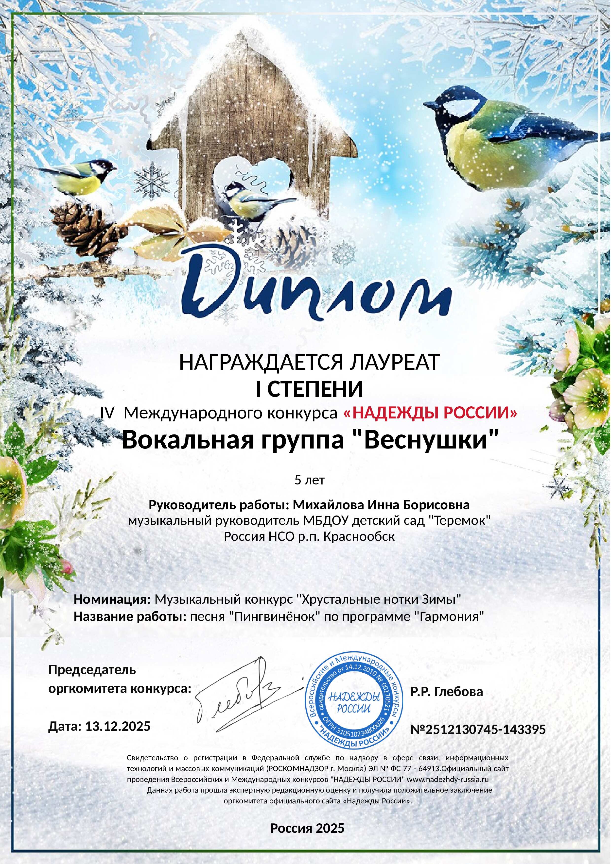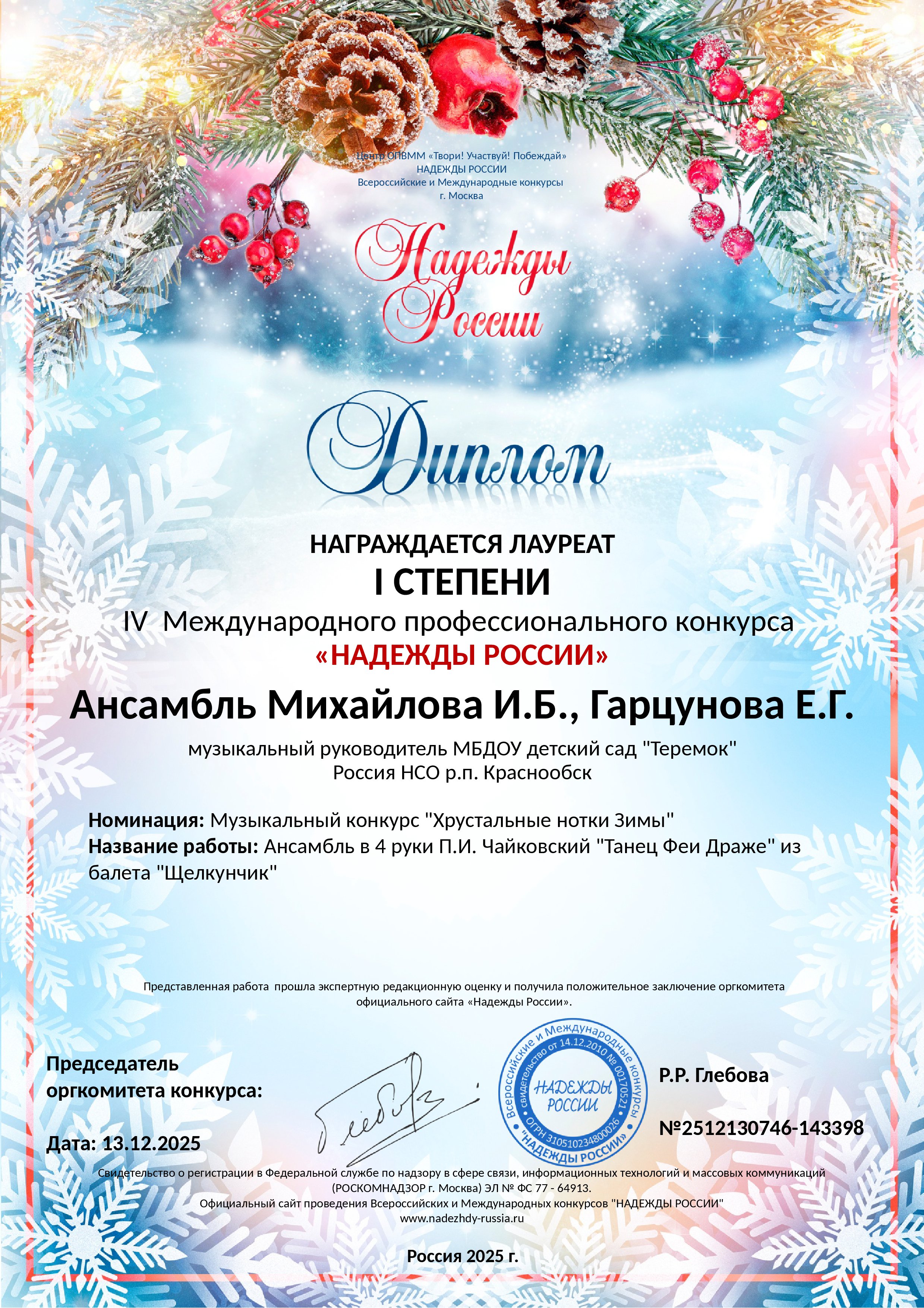 Диплом Лауреата 1 степени IV международного профессионального конкурса "Надежды России" Ансамбль Михайлова И.Б.,Гарцунова Е.Г. 2025 12.13