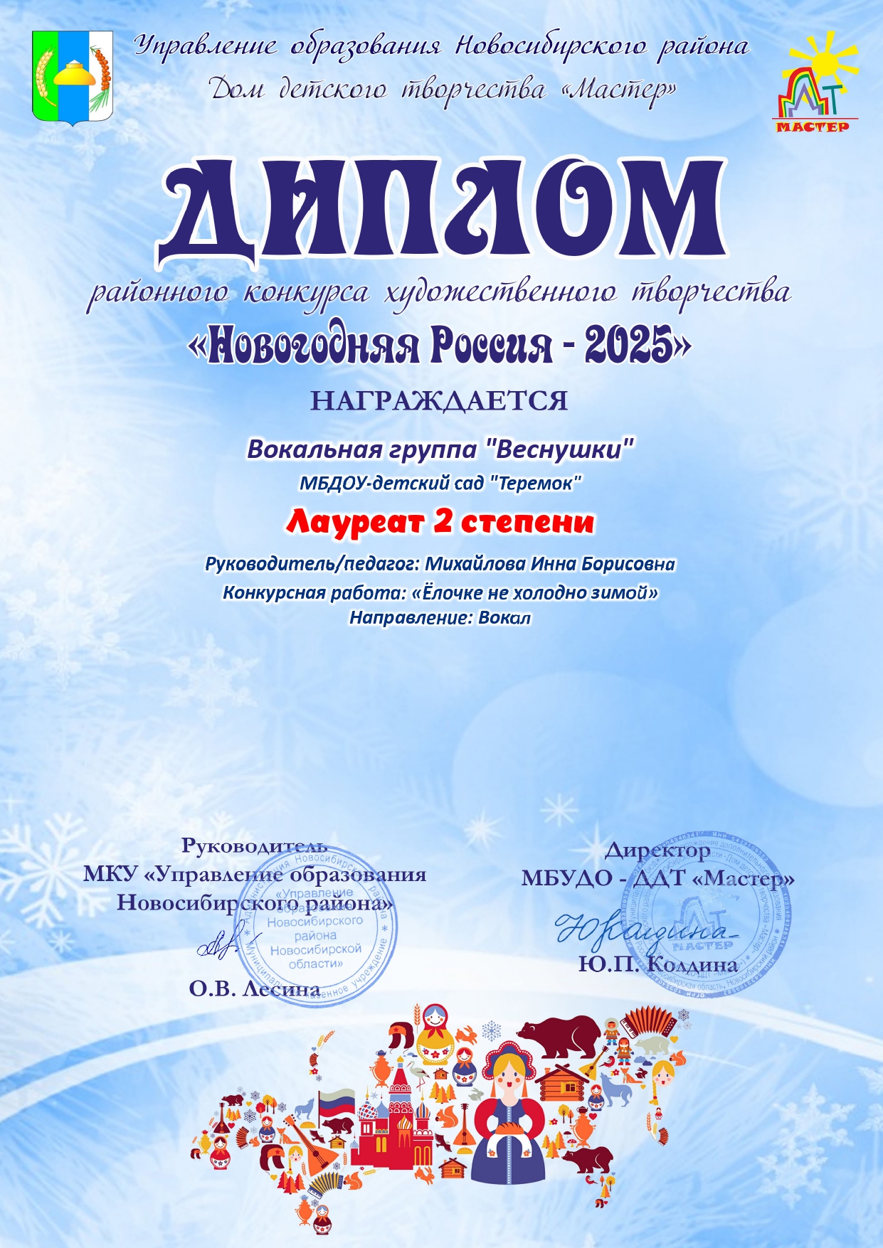 Диплом Лауреата 2 степени районного конкурса "Новогодняя Россия - 2025" вокальная группа "Веснушки"