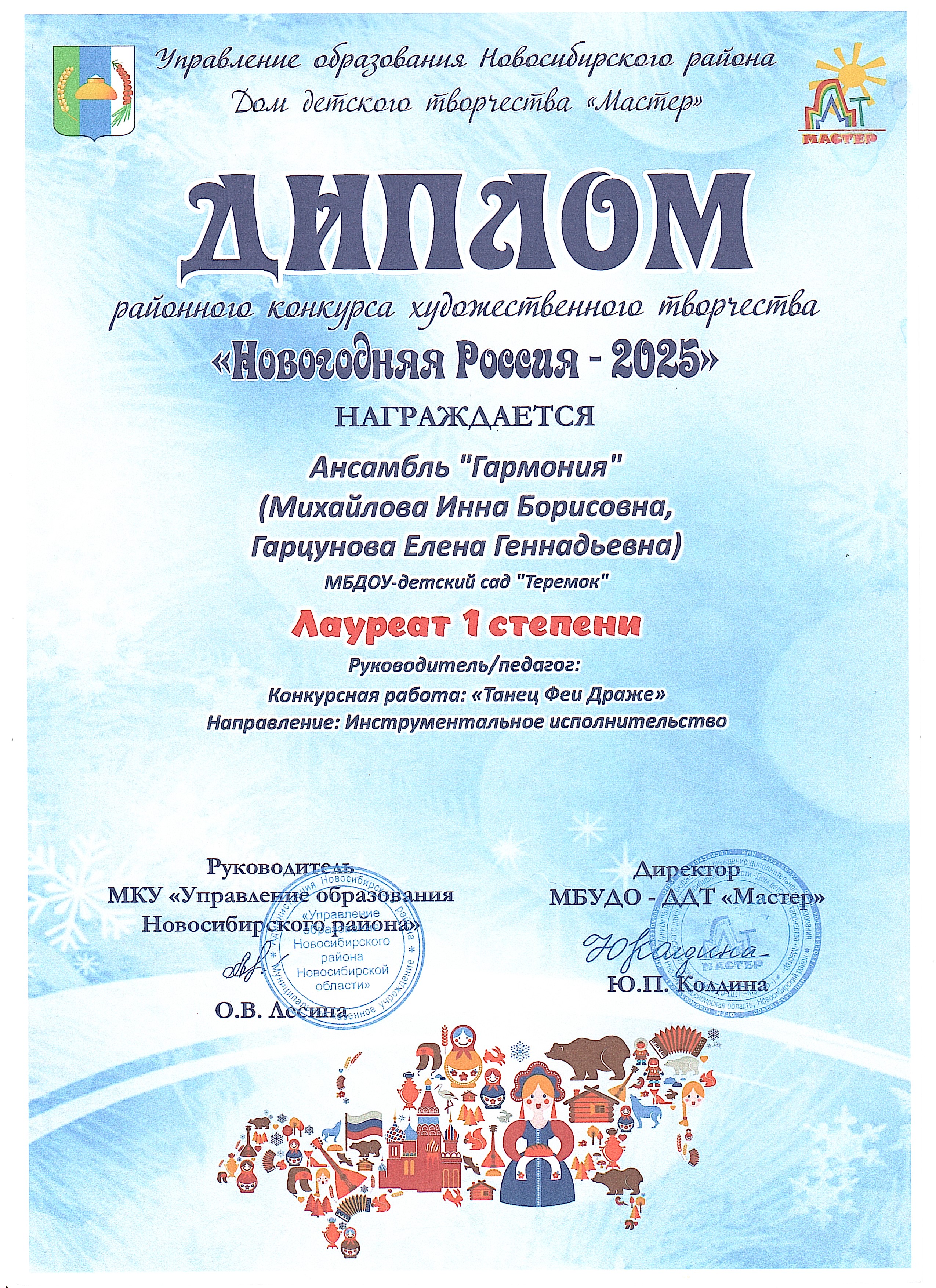Диплом Лауреата 1 степени районного конкурса "Новогодняя Россия - 2025" Ансамбль "Гармония" Михайлова И.Б.,Гарцунова Е.Г.